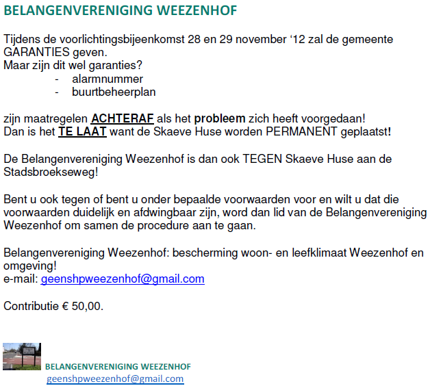 Op 12-11-2012 hebben drie bewoners uit de Weezenhof die neutraal staan ten opzichte van de komst van de Skaeve Huze een overleg gehad met de