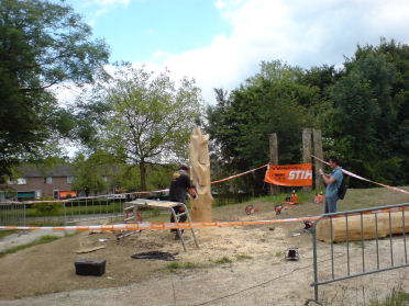 Wethouder Milieu Jan van der Meer opende het park symbolisch door het doorzagen van een gebeeldhouwd stuk hout met een kettingzaag. Dat lukte zonder gewonden of erger.