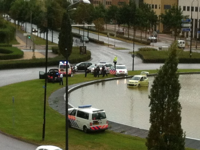 De verdachte is na zijn crash in de fontein op het verkeersplein gewond afgevoerd naar het ziekenhuis. Dat meldt de politie op Twitter. De recherche deed zowel op de Paukenstraat als op het Takenhofplein onderzoek.