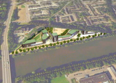 Het flatcomplex dat langs het MaasWaalkanaal bij de Dukenburgsebrug in Zwanenveld wordt gebouwd, krijgt een groene dakbedekking met vetplantjes.