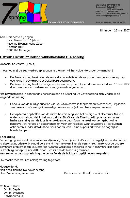 Stichting "de Zevensprong", het overkoepelende platform van de 7 wijkplatforms in Dukenburg, heeft deze week een brief doen uitgaan naar de gemeente Nijmegen. In de brief reageert het platform officieel op de plannen van de gemeente (zie ook hier) om de kleine winkelcentra te herstructureren, met als gevolg dat winkelcentrum Malvert zal gaan verdwijnen.